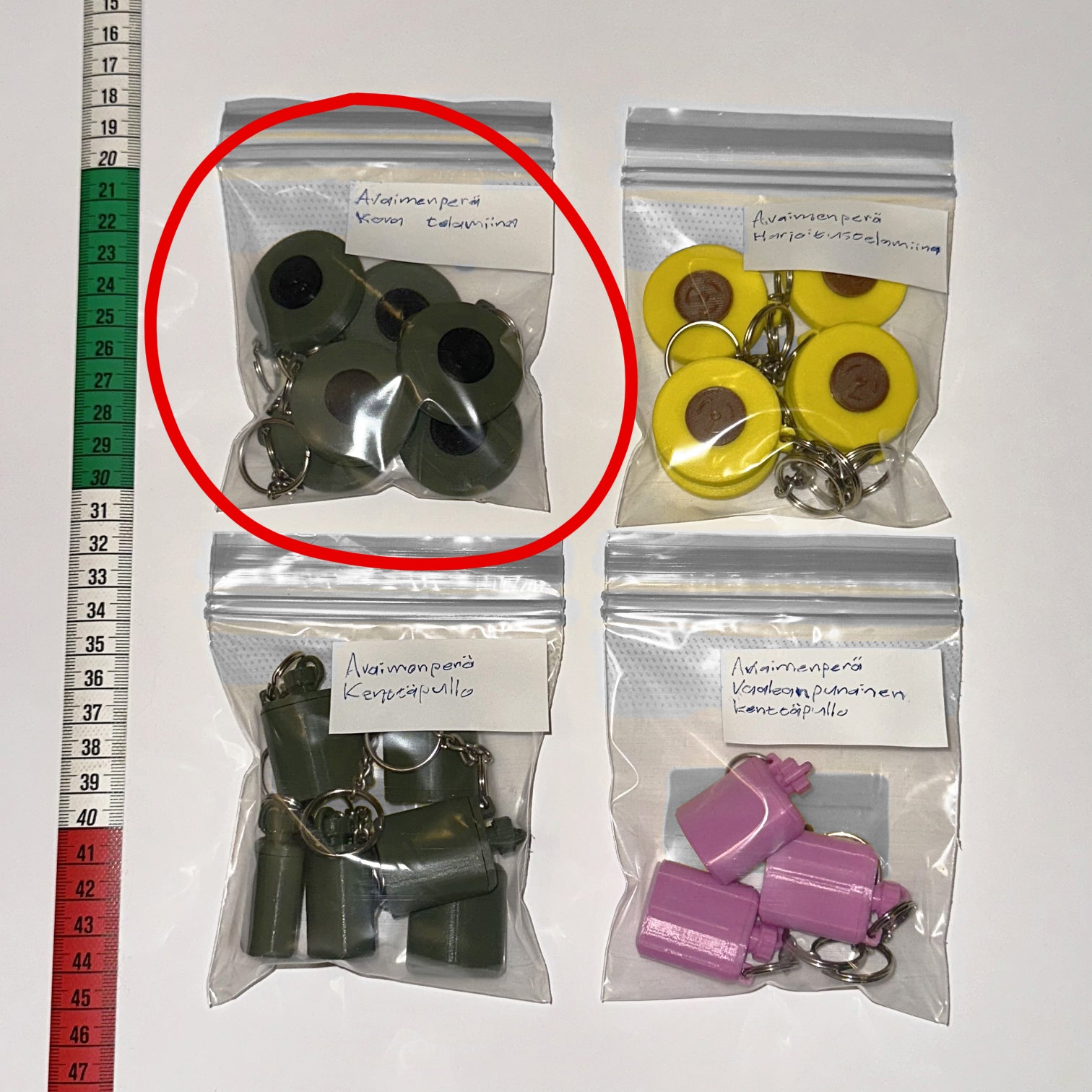 Pienoismallinen telamiina avaimenperäksi. Valmistettu Suomessa. Muovinen.
