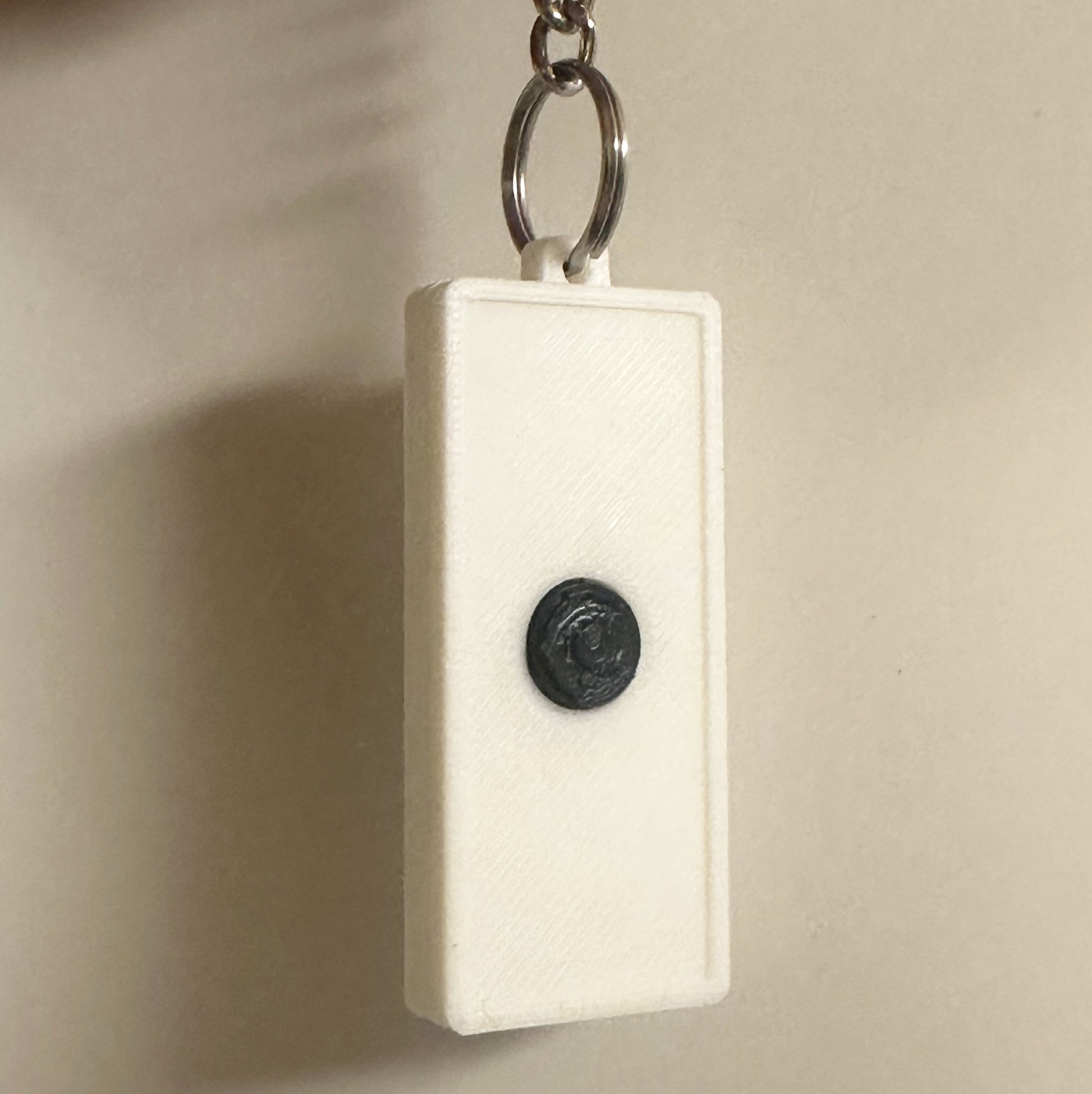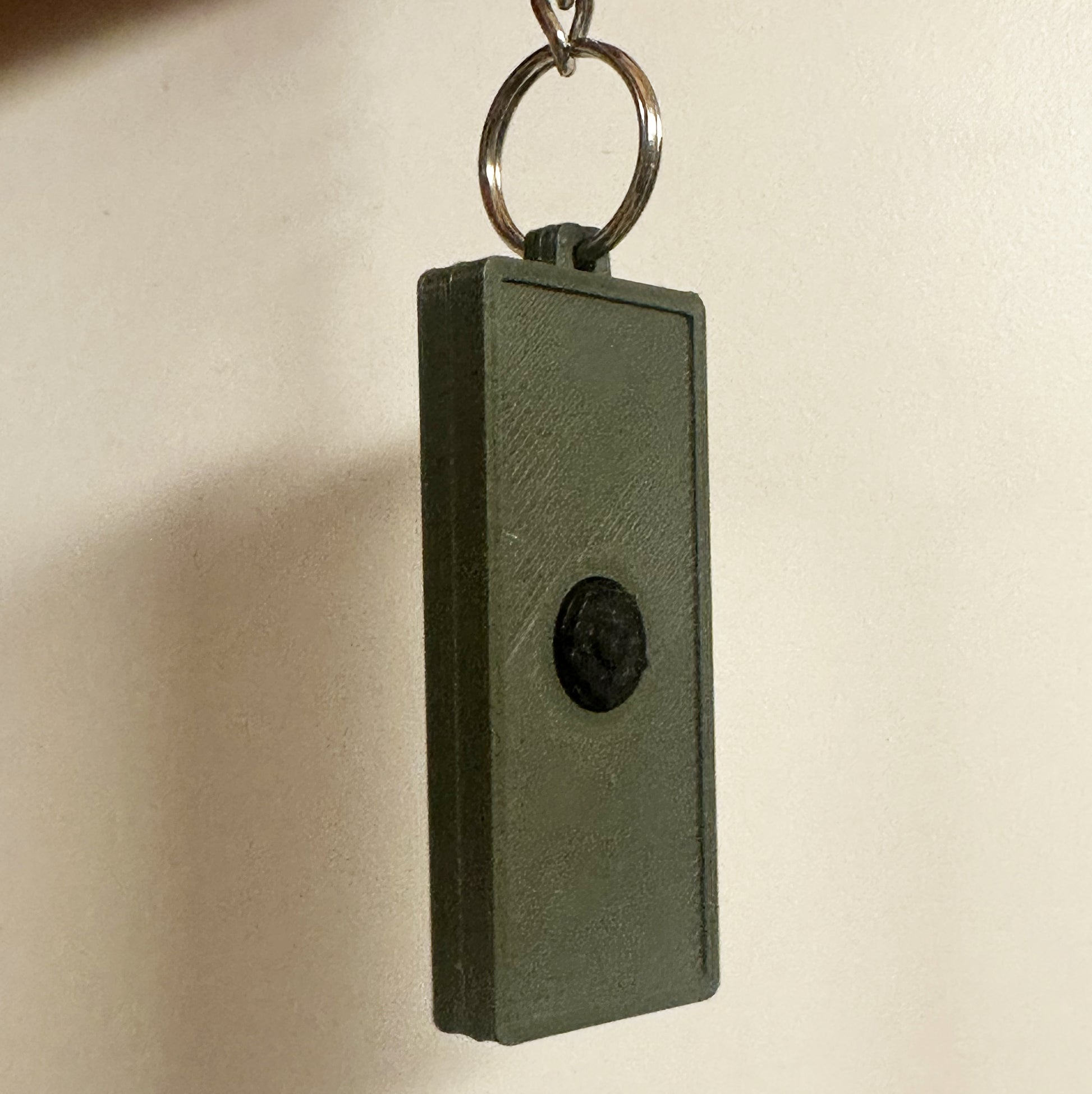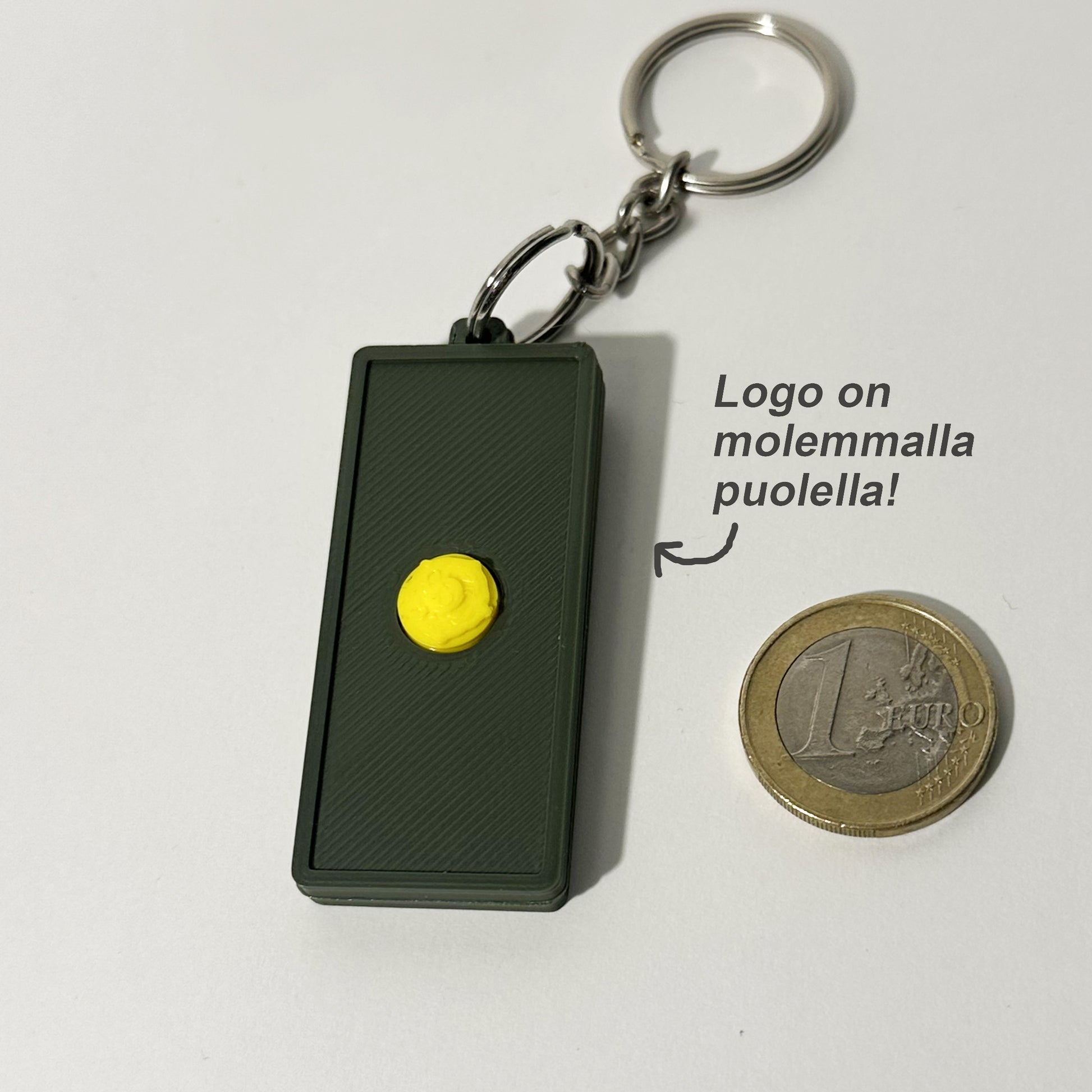 Pienoismallinnettu vänrikin rintalappu avaimenperäksi. Valmistettu Suomessa. Muovinen.